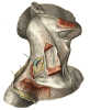 области груди на уровне II ребра, направляются вверх и медиально и, достигнув края нижней челюсти, своими медиальными пучками переплетаются с пучками одноименной мышцы противоположной стороны и прикрепляются к краю нижней челюсти; латеральные пучки мышцы переходят на лицо, где вплетаются в fascia parotidea et fascia masseterica и достигают угла рта. Действие: натягивает кожу шеи и отчасти груди, опускает нижнюю челюсть и оттягивает угол рта кнаружи и книзу. Иннервация: г. colli (n. facialis). Кровоснабжение: аа. cervicalis superficialis, facialis.