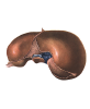 нижняя полая вена. На задней поверхности левой доли внебрюшинный участок между листками венечной связки имеет форму треугольника с вершиной влево и основанием также у нижней полой вены, но слева этот участок значительно меньше и уже. Вместе оба треугольных участка имеют ромбо